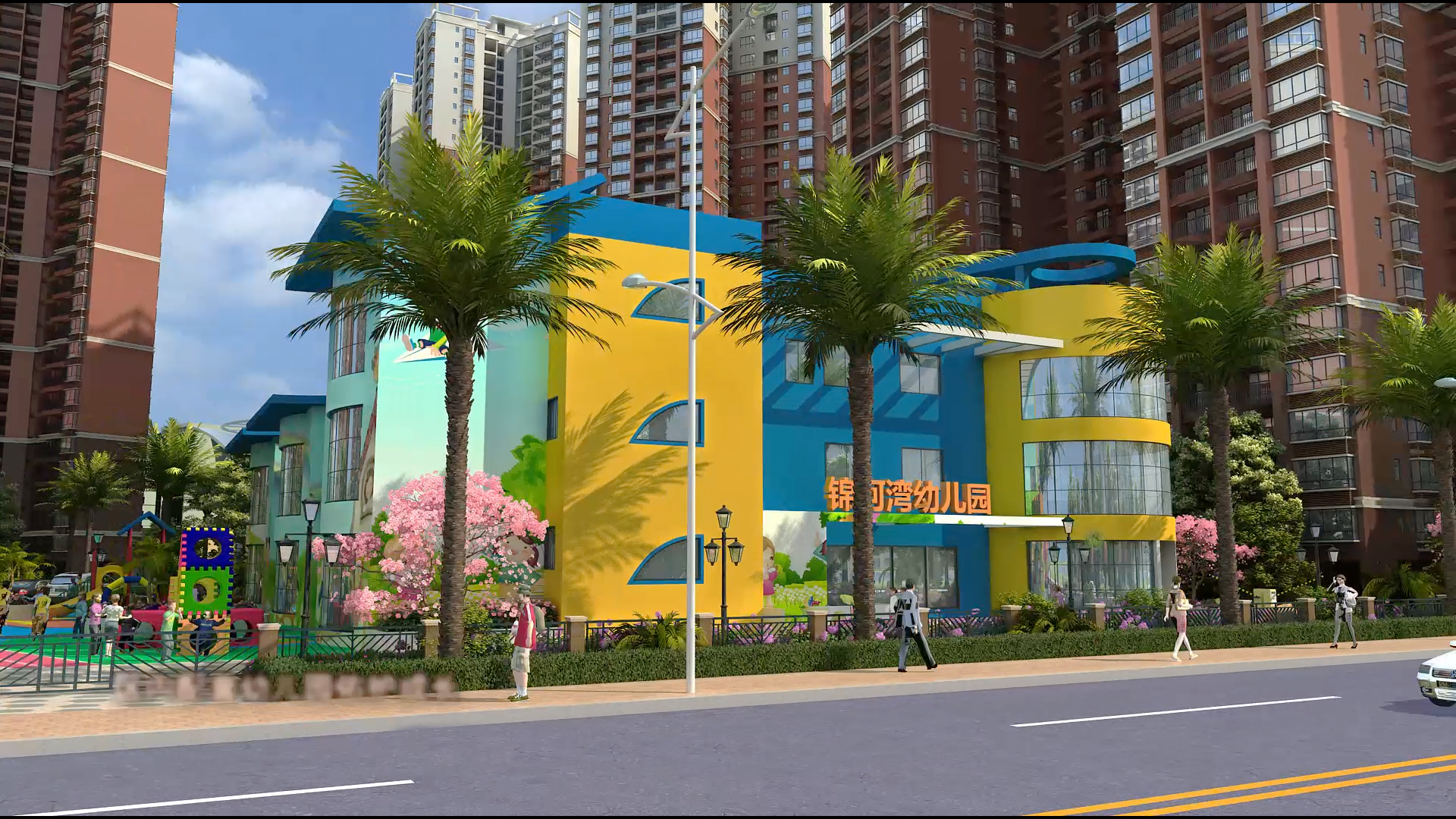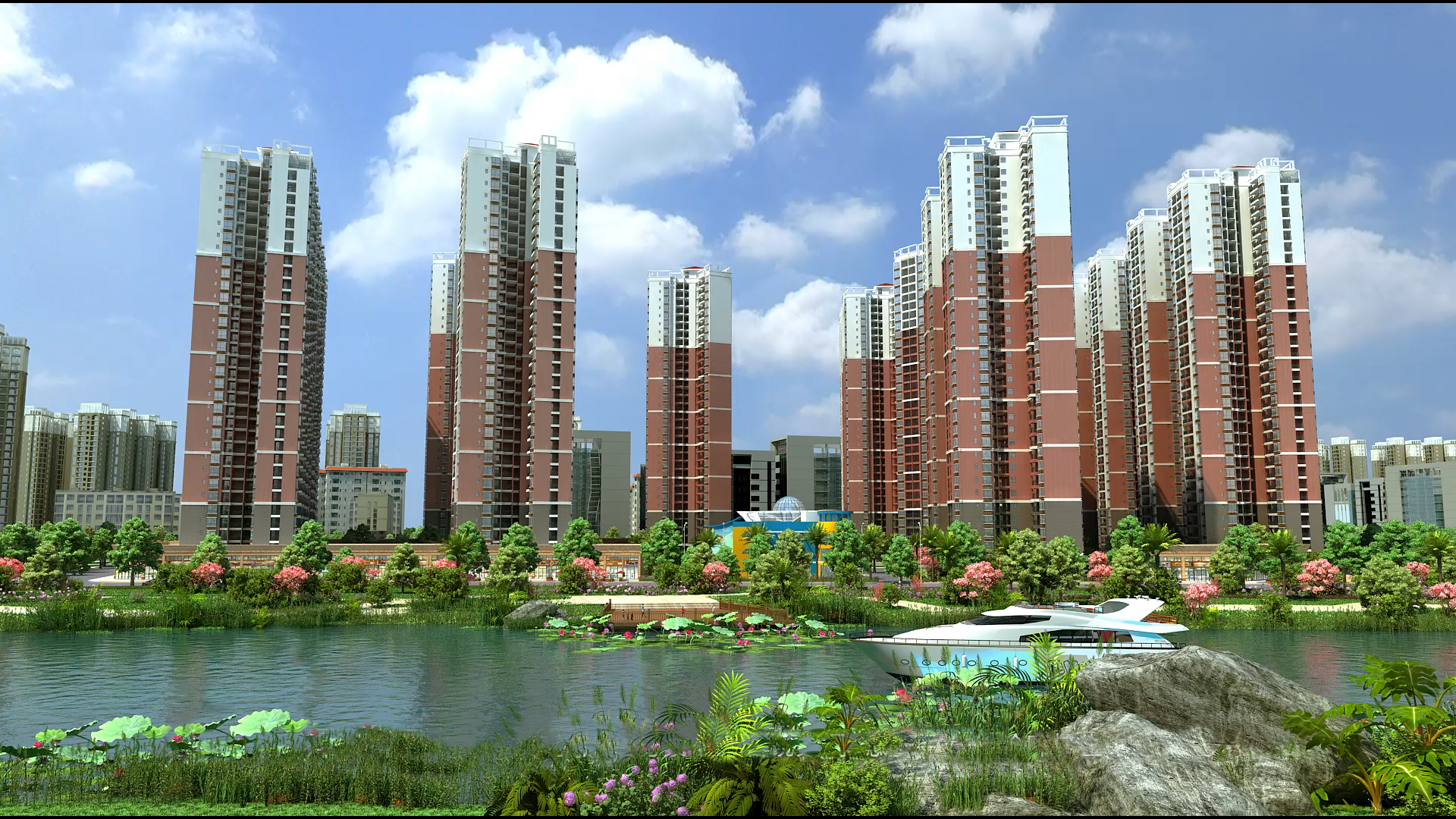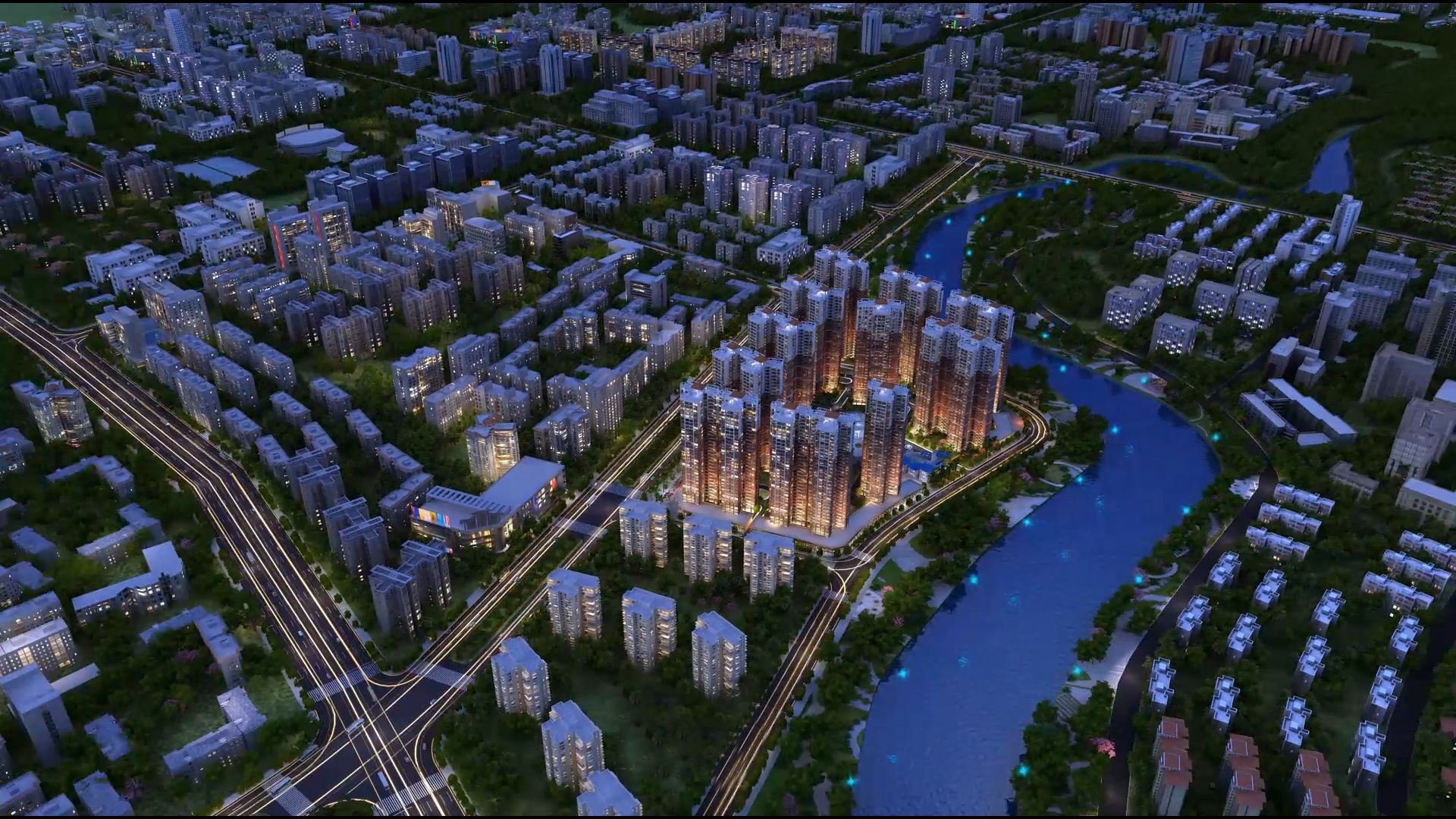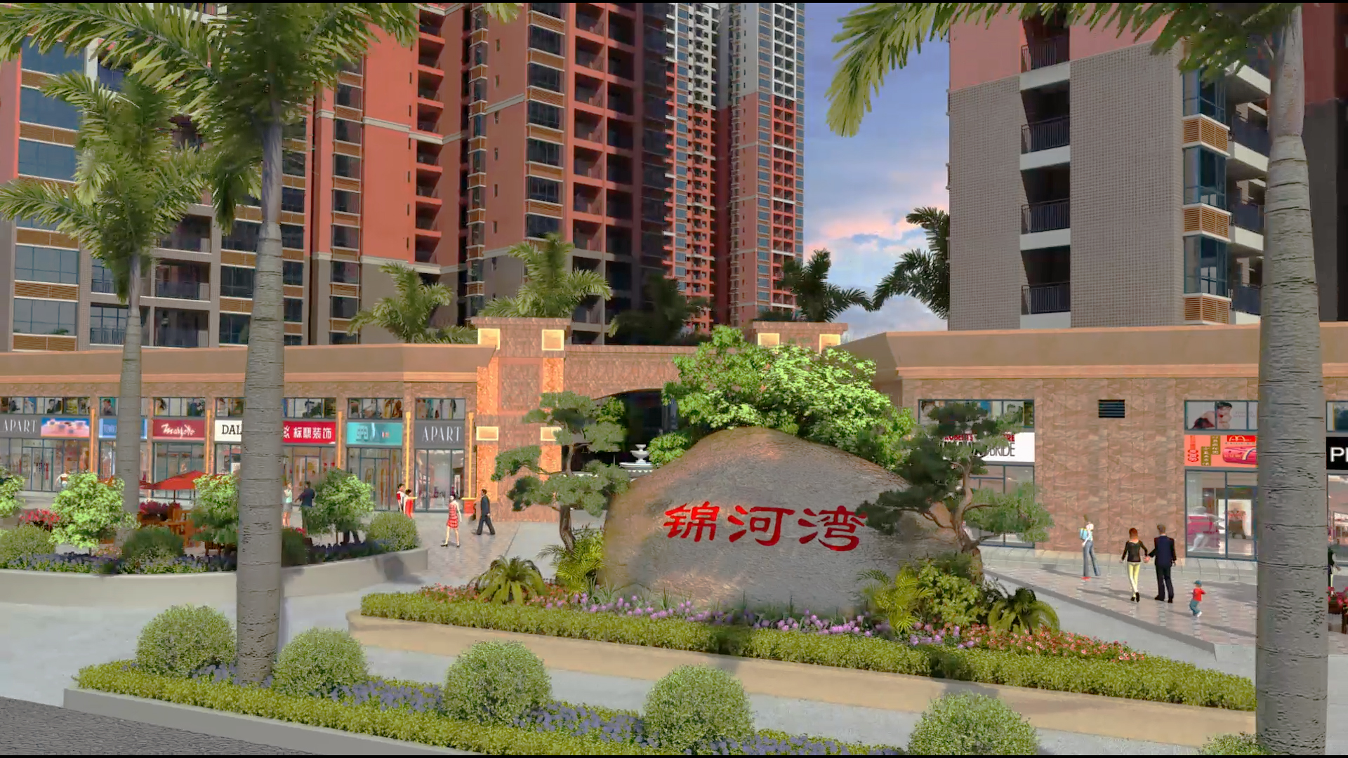 锦河湾的总体布局充分利用位置优势和环境优势,小区住宅设计间距、通风采光、日照均满足设计规范要求,并在规划设计利用此布局把东面河滨公园与对面别墅区的优美景色引入本小区,达到“借景”的目的。