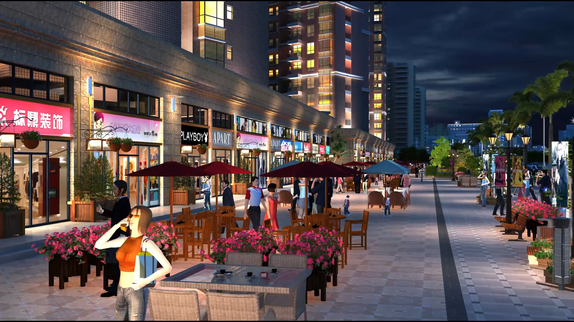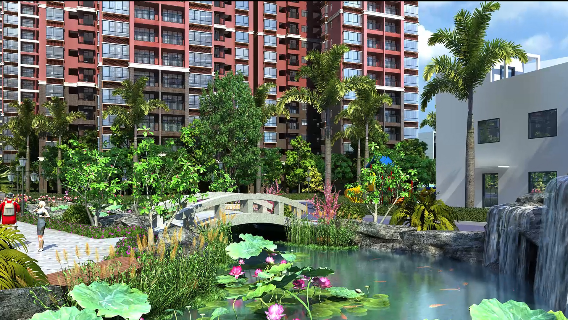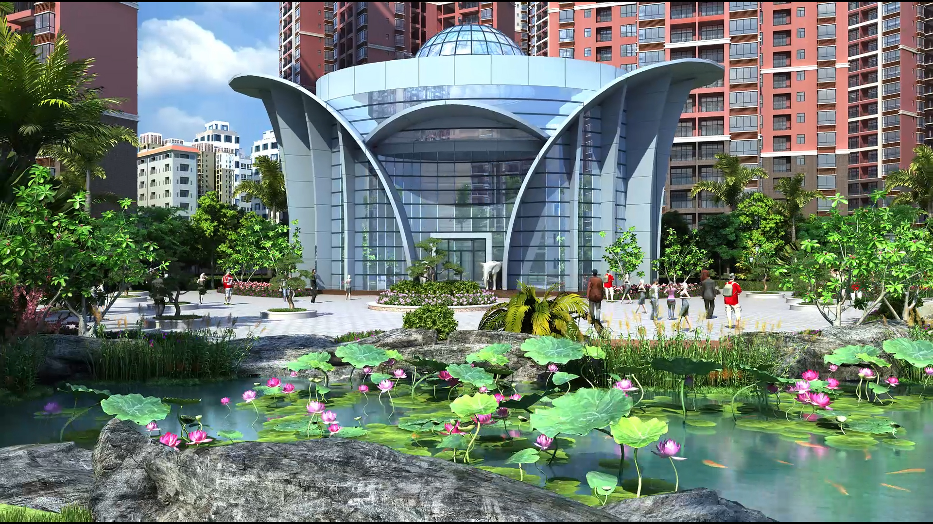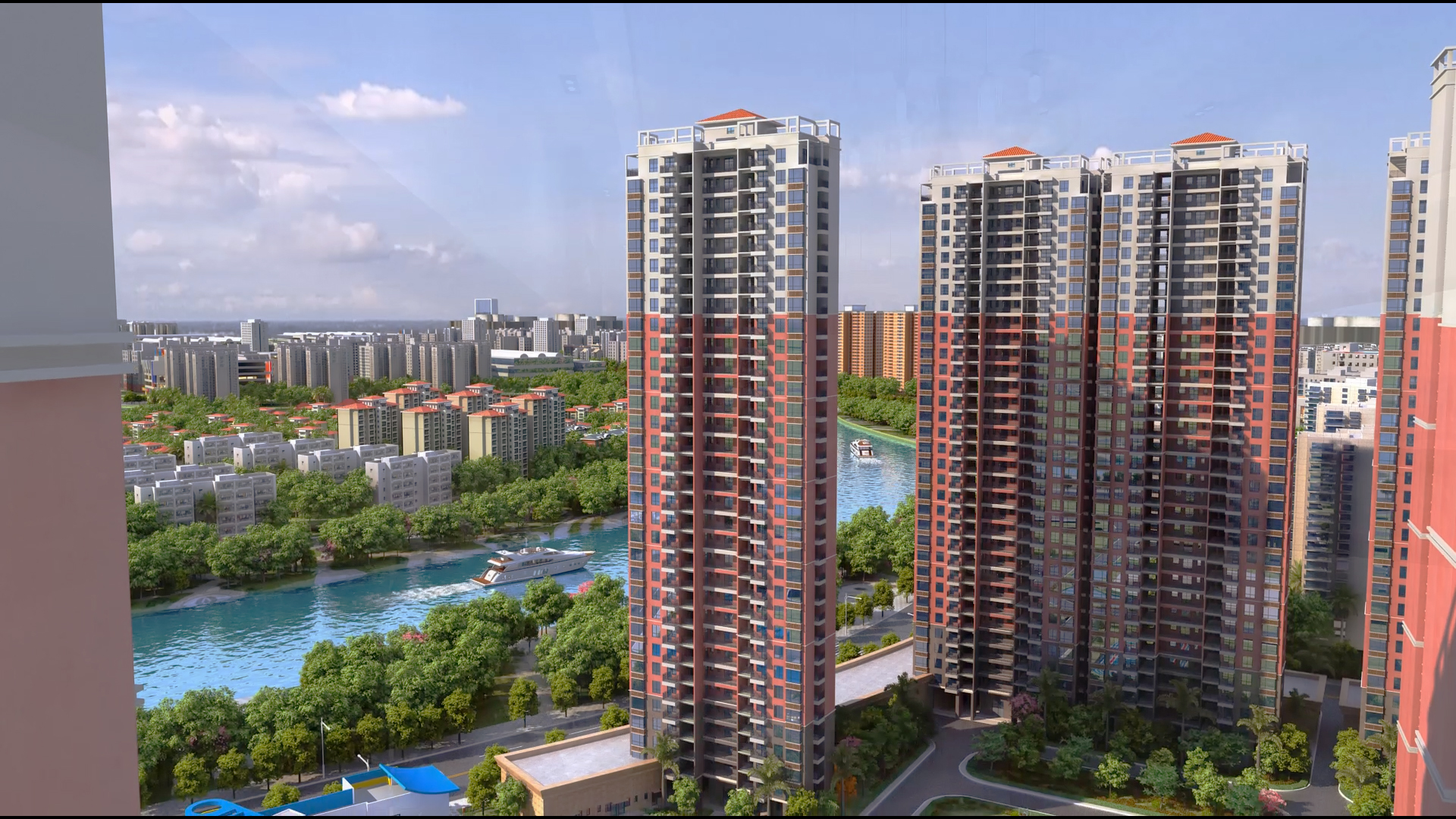 锦河湾的总体布局充分利用位置优势和环境优势,小区住宅设计间距、通风采光、日照均满足设计规范要求,并在规划设计利用此布局把东面河滨公园与对面别墅区的优美景色引入本小区,达到“借景”的目的。