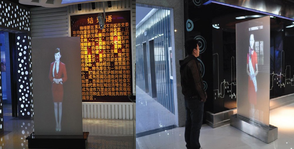 展示设计: 虚拟迎宾员,一块透明屏幕,当参观者走近屏幕时,红外自动感应观众的到来,屏幕上会立刻出现一个形象较好真人立体影像,虚拟迎宾员会向观众眨眼,挥手,打招呼或者做一些展厅的介绍宣传等。