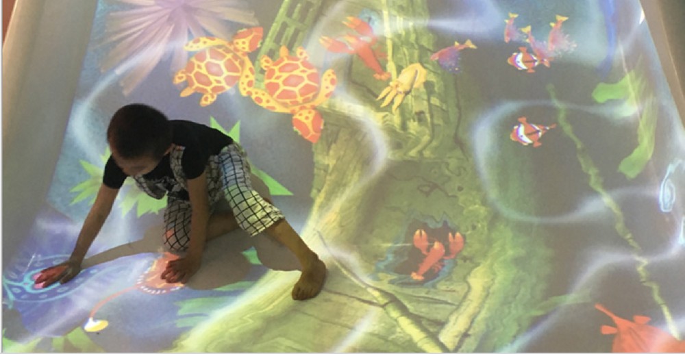 当小朋友进入到投射画面范围内,可以直接与投影在地面上的游戏场景进行互动,随着走过的脚步,产生美轮美奂的互动效果,系统根据时间的设定随机切换不同界面。