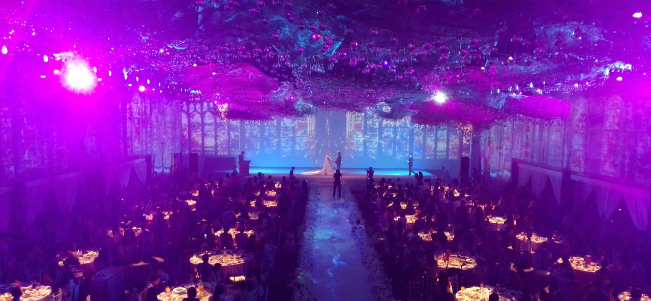 升级改造后的宴会厅,搭配上花艺和造景,并融入全息项目的虚拟场景,加上人物的配合,实现了现实与虚拟的完美结合,也使舞台的场景包裹性更强。新人站在舞台的正中央举行仪式,给予成像灯点缀和暗场配合,在现场的宾客眼中,新人就是在如此浪漫、如此梦幻的场景中完成了他们神圣的婚礼仪式。
