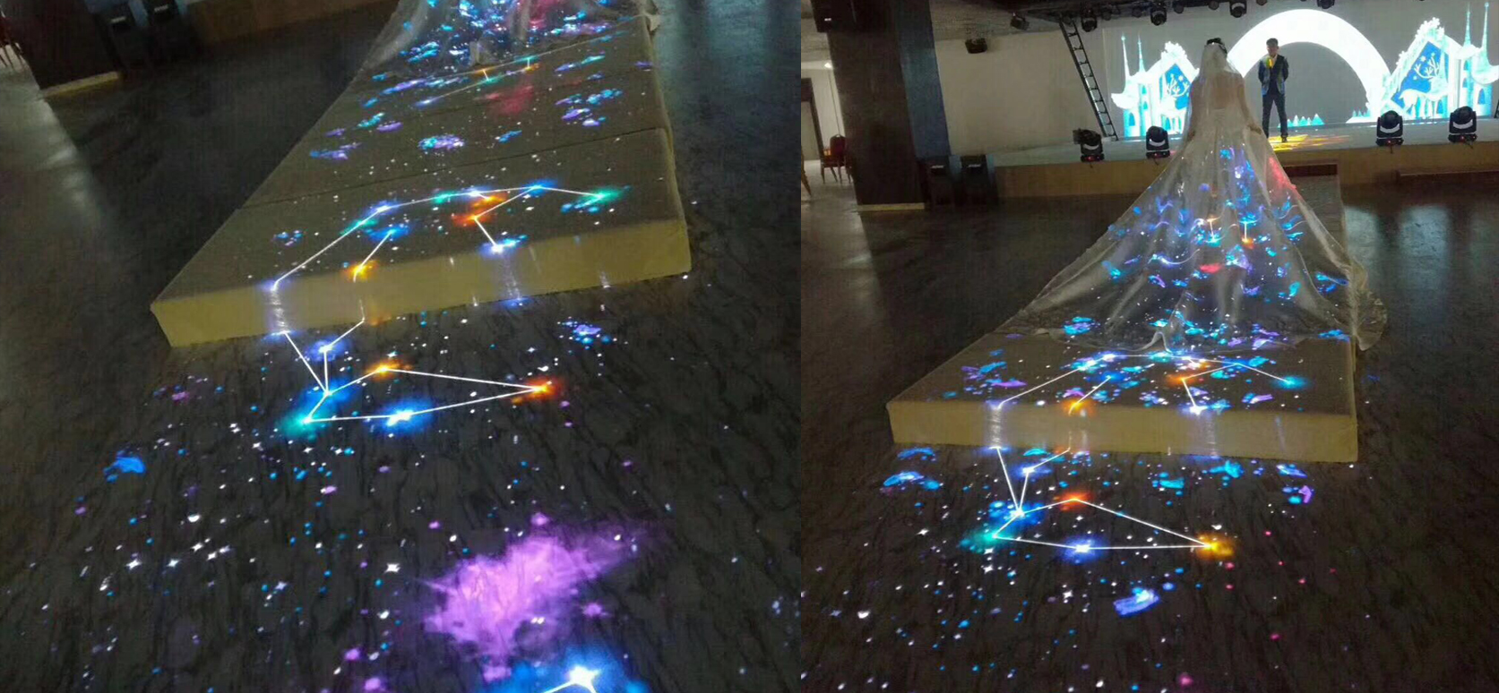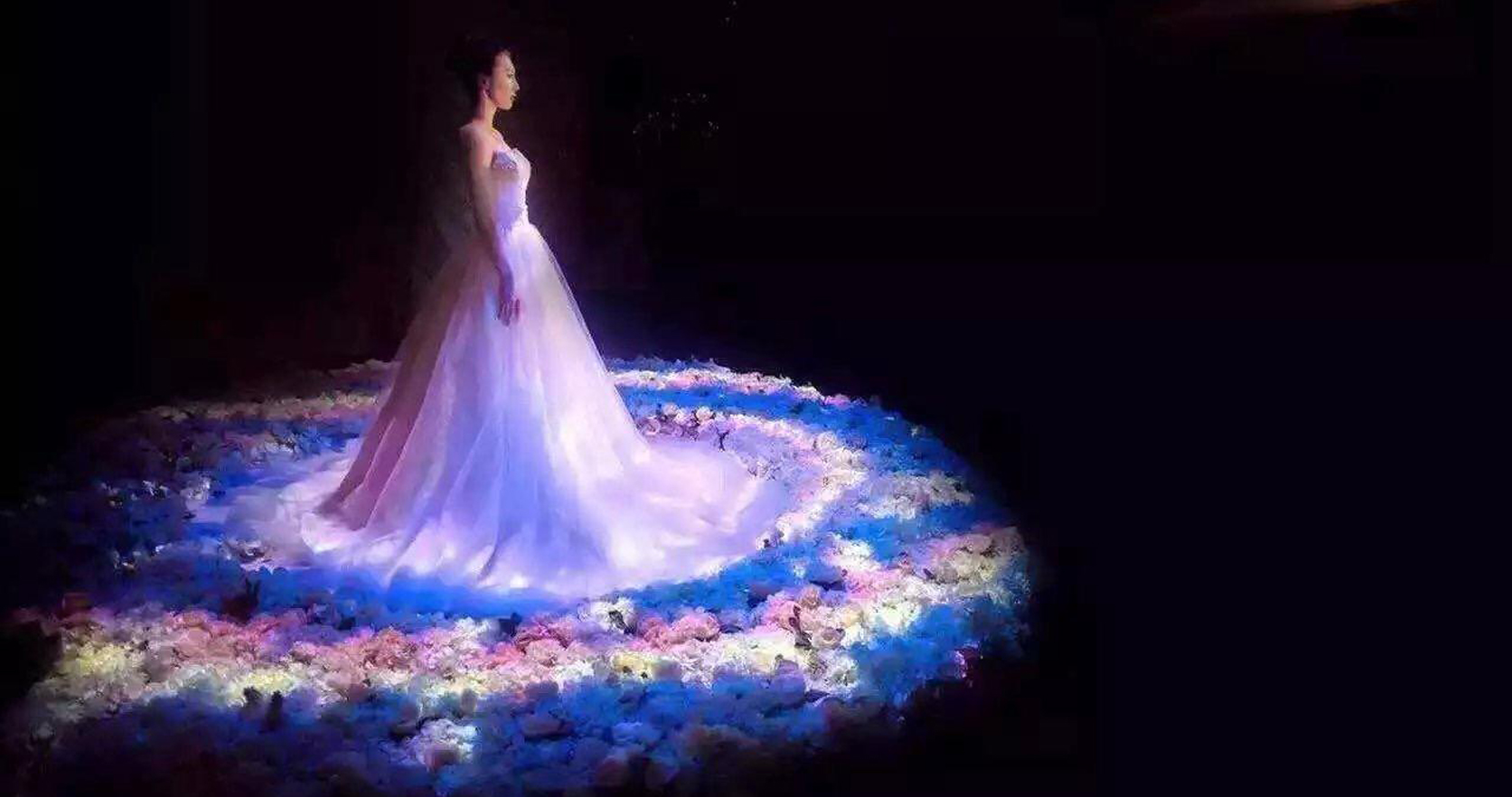 传统的婚礼舞台道具搭建同质化严重,难以满足广大消费者的专属定制需求。3D全息宴会厅使用全息等科技手段,将创意空间无限放大,不但可以满足策划师新人天马行空的想象,同时还可将新人抠像植入到初识相遇的场景,将虚拟的超大空间还原到现场,演绎一段浪漫唯美的爱情故事。增加个性化的婚礼出场方式,颠覆传统婚礼的一成不变。
