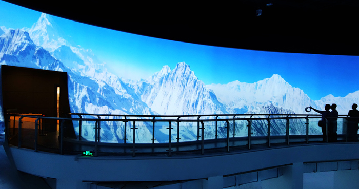 根据环幕尺寸的大小,环幕按照通道和环形幕半径的大小来区分,通常为90、120 、135、180、240、270、360度弧度不等,一般分为双通道、三通道、七通道等,其中双通道和三通道时最常用的。双通道和三通道立体虚拟仿真环幕投影大屏幕是虚拟三维投影显示系统中一种沉浸式虚拟仿真显示环境,这个系统采用边缘融合技术把多台投影打出的图像形成立体数字图像实时输出并显示在一个超大幅面的平面投影幕墙上,使观看和参与者获得一种身临其境的虚拟仿真视觉感受。通常用于一些大型的虚拟仿真应用:虚拟战场仿真、数字城市规划、三维地理信息系统等大型场景仿真环境、展览展示、工业设计、教育培训、会议中心等专业领域。