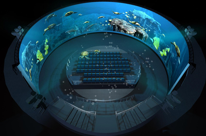 环幕投影又称环幕投影系统,包含环幕系统和环幕投影。环幕投影系统分为立体环幕投影和非立体环幕投影。环幕(立体)投影系统是一种视听高度沉浸的虚拟仿真显示环境,采用多台投影(通道)组成的环形投影屏幕,环形幕半径通常有100~360弧度不等,由于其屏幕半径宽大,观众的视觉完全被包围,再配合环绕立体声系统,使参与者充分体验一种高度身临其境的三维立体视听感受,获得一个具有高度沉浸感的虚拟仿真可视环境,是传统平幕显示设备不能比拟的,环幕投影最重要的应用就是立体投影系统。