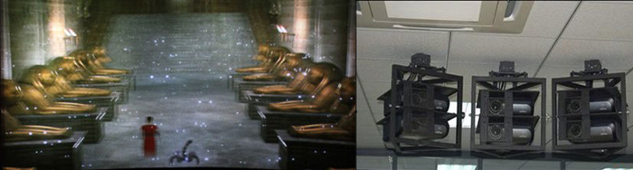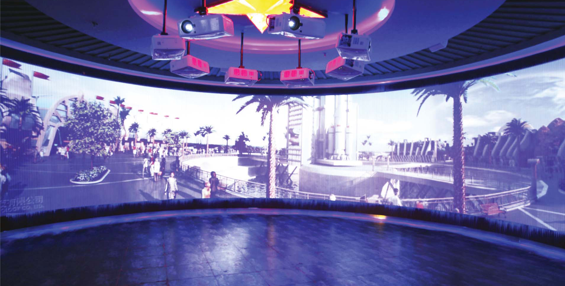 正是由于环幕屏幕的显示半径巨大和显示特征导致了它的技术复杂性,通常一个完整的环幕投影系统需要有以下几项强有力的核心技术做支撑:数字几何矫正(即非线性失真矫正)技术、多通道视景同步控制技术、数字图像边缘融合技术,才能成功地将三维图形计算机生成的实时三维数字影像、实时同步地输出并显示在一个具有一定半径和弧度的巨幅环形投影屏幕上,从而形成一个具有极高分辨率的、无任何变形失真的数字三维立体影像。