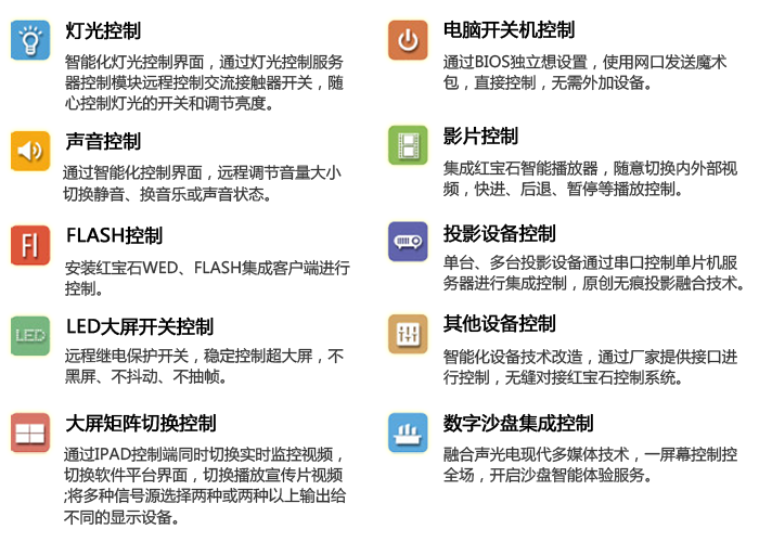 红宝石数字影像智能中控系统不仅能控制电脑、投影机、显示器、时序电源等一般设备时表现优异,还能对多达256路的沙盘灯光,照明灯光、红外感应设备、摄像头、门、窗帘、舞台灯光等应用型设备进行有效控制,并且具有优越的稳定性和良好的操作性,用户界面友好,采用无线网络控制,突破时间与空间限制。